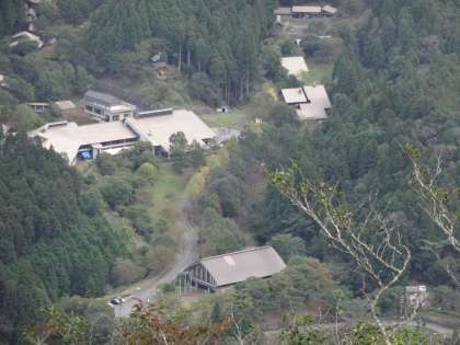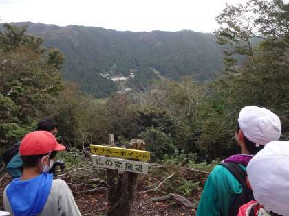 下山しながらさらに進んでいくと,ちょうど花背山の家の全景が見えるところに。ここは「ヤッホーポイント」といい,同行してくださっている花背山の家の職員さんと,花背山の家に残っている職員さんとやり取りをし,みんなで「ヤッホー」と叫んで山の家まで届くかを確認してくださいます。みんなの大きな声は,しっかりと山の家に届きました!