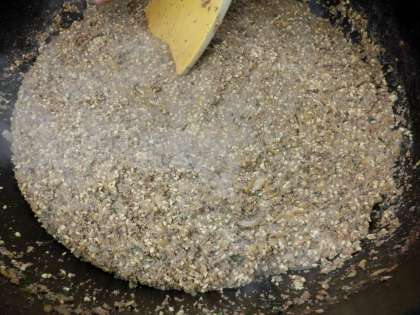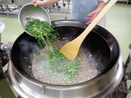 肉みそ納豆は、牛ひき肉・ひきわり納豆・たまねぎ・青ねぎ・しょうが・にんにくをいためて、みそを合わせた調味料で味つけをしています。