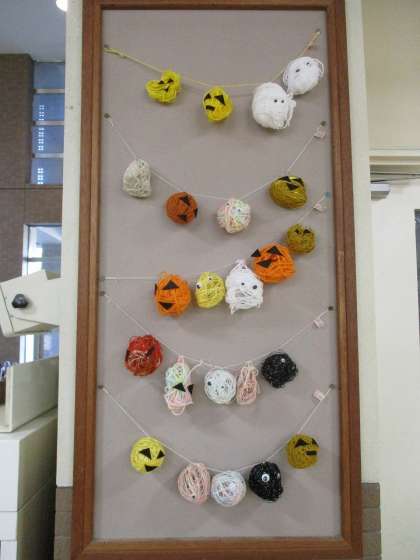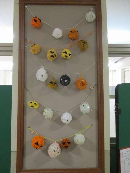 図画工作科の時間に、10月の掲示物を作りました。10月といえば、そう、ハロウィンです。カボチャとおばけを毛糸などを使って作りました。心なしか、作った人によって表情も違う気がします。