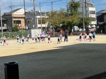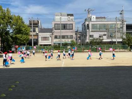 3,4時間目の運動場では、2年生が体育科の学習で、運動会の練習をしていました。