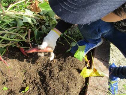 春から大切に育ててきたサツマイモをとうとう収穫しました。「ちゃんとできているかな?」「どれくらいとれるかな?」とドキドキしながら収穫した子どもたち。たくさん収穫できてみんな嬉しそうでした。中には、ひびが入っていたり、穴が開いていたり、少し芽が出ているものもありました?「これは食べられるのかな…?」と心配そうでしたが、調べてみると「その部分を避けて食べたら大丈夫。」とのことでした。無農薬だからこその面白い形を楽しみながら、いただきたいと思います。2〜3日、あるいは2〜3週間置いておいた方が甘くなるそうなので、またその頃に調理実習をしようと計画中です。