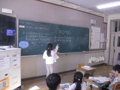今回の学習では、3つの関係を図に表して、「○倍の△倍は(○×△)倍」ということに気が付き、一気に答えを求める方法を見つけることができました。ノートに図を描いたり、前で発表したりなど、自分の考えを表現することを頑張っています。