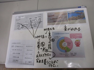 今日は、参勤交代という制度が各地の大名にどんな影響を与えたのかを資料をもとにグループで考えました。