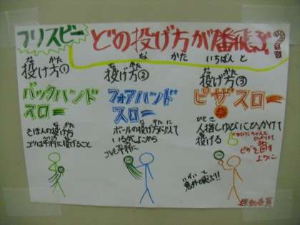 運動委員会からの挑戦状を出したり、ビンゴをするといいなどの意見が出てきました。今回は、まず挑戦状や遊び方をポスターにして出すことにしました。フリスビーを使う人がふえると嬉しいですね☆