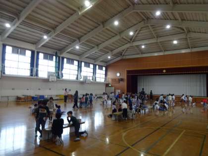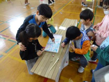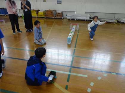 3,4時間目、体育館から何やら楽しそうな声が聞こえていたので、のぞいてみると、1,2年生が生活科の学習をしていました。2年生が「あそんで ためして くふうして」の学習で作ったいろいろな遊びを1年生に紹介し、楽しく遊んでいました。