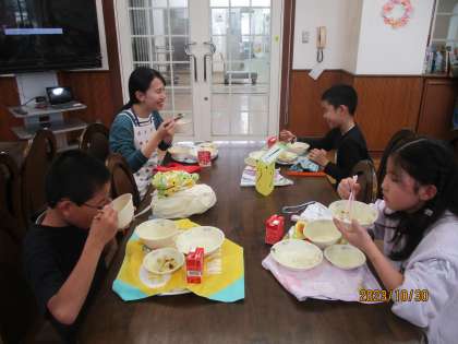 コロナ禍が明けて、学校ではランチルームでの給食が始まりました。4年生の順番も回って来て、教室で食べるのとはまた違った雰囲気で、楽しく食べることができました。栄養教諭の中西先生からも五感で味わって食べましょうと教えてもらい、楽しいだけでなく味わって食べることができました。