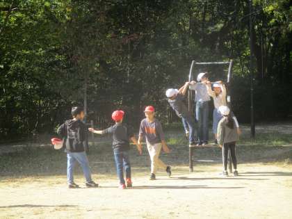 小関越えをして長い道のりを歩いたので、お弁当を食べて体力を回復させました。各ご家庭で準備していただいたお弁当を楽しみにしていたので、どの子も笑顔でお弁当を食べていました。その後、疏水公園で少しの時間休憩しました。体力が回復した子どもたちは、走り回って鬼ごっこをしたり、ブランコやすべり台で遊んだり、虫探しを始めたりととても楽しそうで、子どもたちの元気さに感心しました。