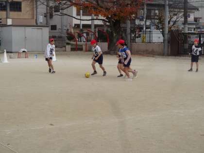 3時間目の運動場では、4年2組が体育科「サッカー」の研究授業をしていました。みんな一生懸命作戦を考えながらゲームに取り組んでいました。