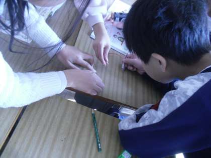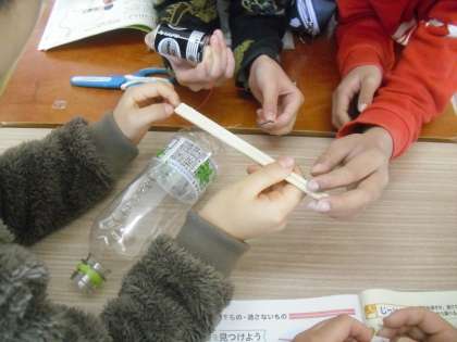 「空き缶は通しそう!」「はさみの切るところは通しそうだけど、もつところは通るのかな」などと話していました。実際に実験をして、予想と同じだったのかを確かめました。そして、実験の結果から、「金属は電気を通す」ことに気付くことができました。