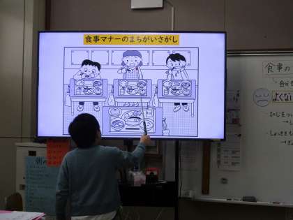 今日はくすのき学級の食の指導とランチルーム給食がありました。食の指導では、食事のマナーの間違い探しということで、イラストを見ながらどこが良くないのか、どうしてそれが良くないのかを考え、発表しました。そのあと、これから自分はどのようなことに気を付けて食事をしたいかを一人ずつ考えました。ランチルーム給食では、さっそく意識しながら給食を食べていましたよ。これからも良い食事のマナーを意識しながら給食をいただきましょう。