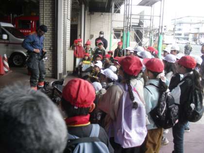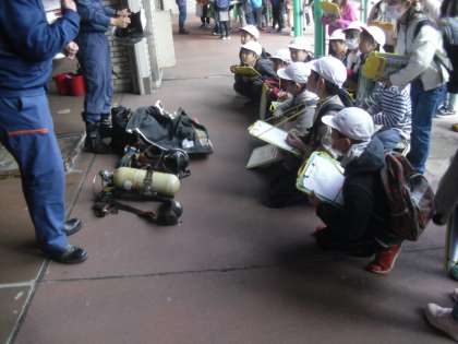 最後には、実際に消防車や救急車、消防隊員の方の服などを見せていただきました。着替える様子も見せていただいて、子どもたちはその速さに驚いていました。