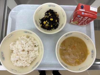 今日の献立は「麦ごはん・牛乳・ポークカレー・ひじきのソテー」です。