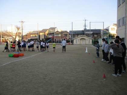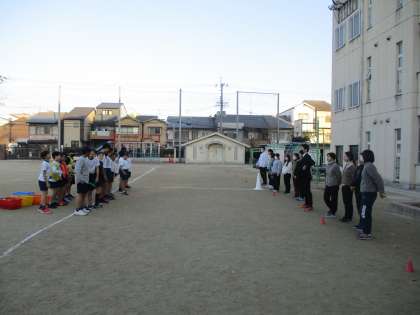 6年生、5年生、教職員でそれぞれチームを作ってトラック走をしました。