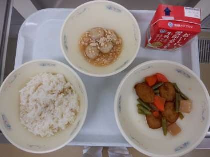 今日の給食は、「麦ごはん・牛乳・平天の煮つけ・揚げ里いものあんかけ」でした。