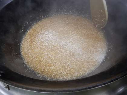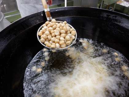 揚げ里いものあんかけは、里いもをこんぶでとっただし・みりん・しょうゆで煮て味をつけてから、米粉をまぶし、油でカラッと揚げました。そしてそぼろあんには、かつお節でとっただしをつかって作りました。揚げ里いもにあんを教室でかけて食べます。