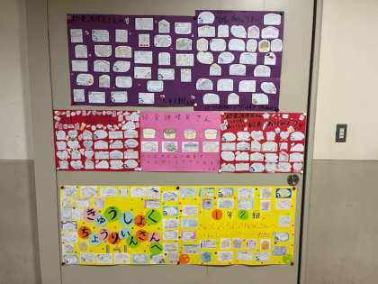 本校では、2月5日から9日までの一週間を、給食週間として設定していました。その時に取り組んだ、給食調理員さんへのメッセージや給食の感想などを、ランチルーム近くに掲示しています。子どもたちが給食を通していろいろなことを学んだり、感じたりしてくれているのだなあと、うれしく思いました。私も毎日給食を楽しみにしています!