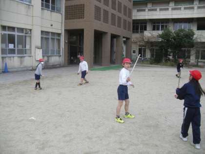 体育科では、「ようぐあそび」の学習を行っています。様々な用具を使って遊びを考え、取り組みます。