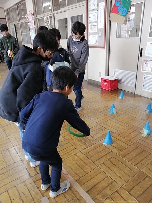 6年生は明日のために、朱三屋台(的当て・魚釣り・くじ引き・輪投げ・ぬりえ)とおにごっこ(朱三版逃走中)を準備してきました。