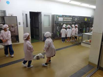 1年生にとって、初めての給食。当番の子どもたちはしっかりと教室まで給食を運んでいました。
