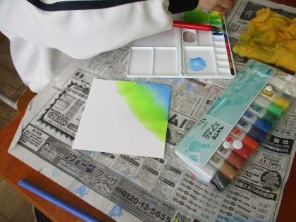 今日は、絵の具を使って色々な色付け方法を試してみました。