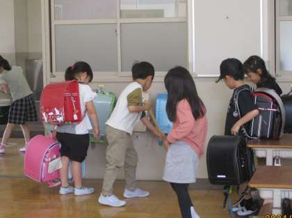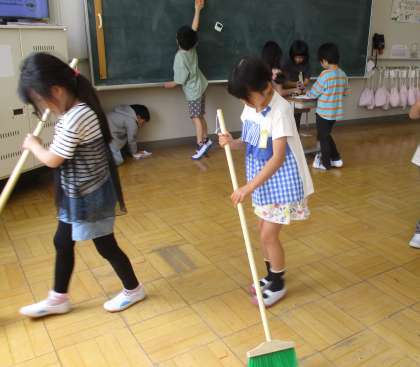 声をかけあってすみずみまで拭いていたり、ランドセルを動かしてほうきで掃いていたりと工夫もみられてとても素敵でした。