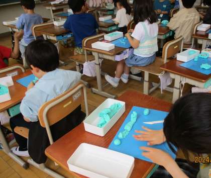 ねん土をつねったり、にぎったり、つぶしたり、ひねったり、、、。