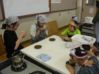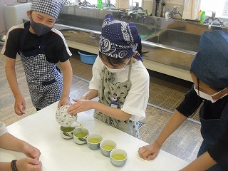 家庭科の学習できゅうすでお茶を入れました。班で協力して、湯呑を洗ったり、水や茶葉を量ったりして進めることができました。