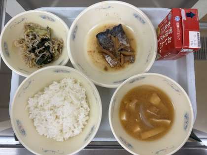 今日の給食は「ごはん・牛乳・さばのしょうが煮・もやしと小松菜のごまいため・みそ汁」でした。