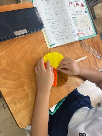 1番初めの学習では角について知るために扇を作りました。