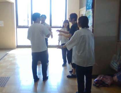 訓練には中京警察署の方にもご協力いただき、不審者はインターホンを鳴らさずに校内に侵入し、3階まで入ってきたという設定で行いました。