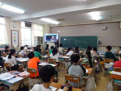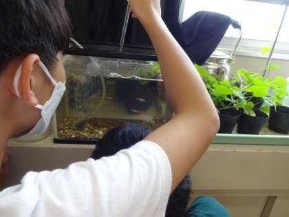 1時間目の6年2組では、理科「生物どうしのつながり」の学習をしていました。ビオトープの水を採ってきて、そこにいる小さな生物をメダカが食べるか調べました。