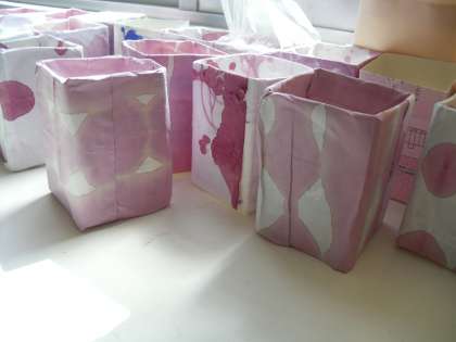 前回色染めをした紙を使って、小物入れをつくりました。牛乳パックの周りに丁寧に紙を貼って、とっても素敵な小物入れが完成しました。