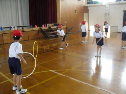 体育「ようぐあそび」では、子どもたちにとって身近な、フラフープを使って学習をしました。