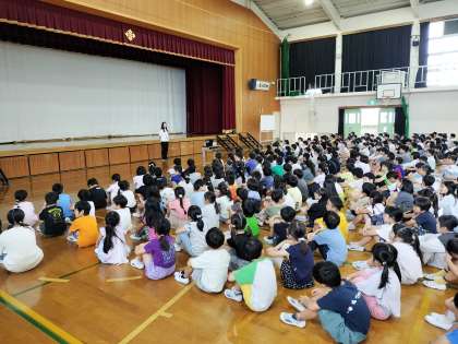 避難訓練の後は、そのまま体育館で10月の朝会を行い、校長先生からは、あいさつのお話をしていただきました。