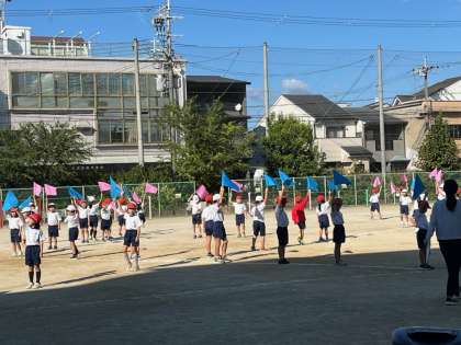5時間目の運動場では、2年生が、運動会の団体演技の練習をしていました。
