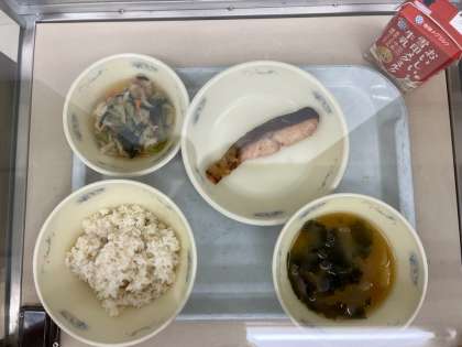 今日の給食は、むぎごはん、牛乳、さけの塩麴焼、小松菜と切り干し大根の煮びたし、みそ汁でした。