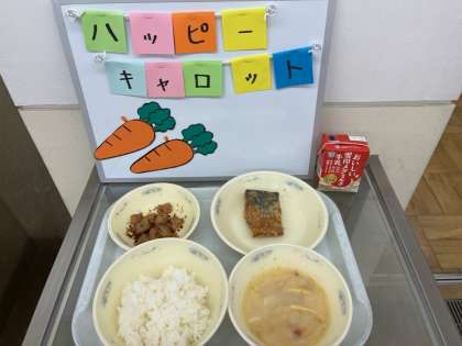 さらに給食調理員さんからは、金時人参のハッピーキャロットのクリスマスプレゼントが!レアなハッピーキャロットが入っていた児童は、大喜びでした!