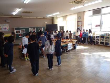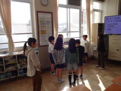 5時間目の4年生の教室では、さんさん学習「伝統文化のすてき発見隊」の学習をしていました。地域の伝統文化や、壬生寺、元祇園梛神社などについて調べたことを、発表する練習をしていました。