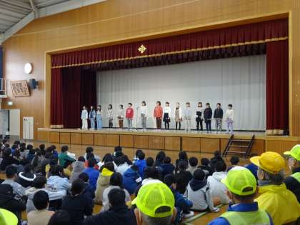 その後、感謝の気持ちを込めて、部活動の「くすのきハーモニー」と「六斎キッズ」が発表を行いました。地域の方への感謝の気持ちを伝えるとともに、全校児童の皆さんに一年間の練習の成果を見てもらう機会ともなりました。