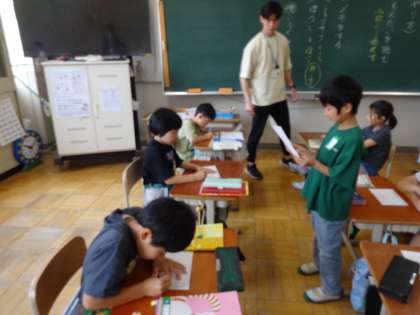 1時間目の2年1組では、国語科「ともだちは どこかな」の学習をしていました。話し手は教科書の絵の中から一人を選び、その人の特徴を伝え、聞き手は、メモをしながら聞き取り、絵の中のどの人のことを指しているのかを探しました。上手なメモの取り方について、しっかり学習していました。