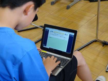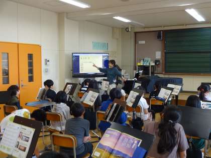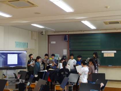 1時間目の音楽室では、6年1組が、音楽科「歌声をひびかせて 心をつなげよう」の学習をしていました。「おぼろ月夜」の情景が浮かぶように歌うにはどのようなことに気を付けて歌うかについて考え、2部合唱で歌っていました。