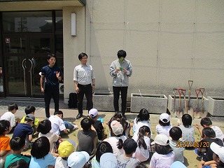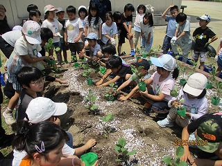 JA全農ふくれんさんと京果さんに来ていただき、なすについて学習しました。なすの種類や生産量、栽培の方法について教えていただいたあと、学校園で一人ひとつの苗を植えました。みんなで大切に育てていきたいと思います。