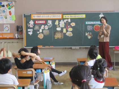 今回は、食べ物の3つのはたらきについてのお話を聞きました。給食には、色々なはたらきをする食べものがバランスよく使われていることを知り、「給食を残さず食べたい。」「苦手なものも食べるようにしたい。」など、給食を食べるときのめあてを考えました。