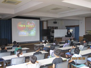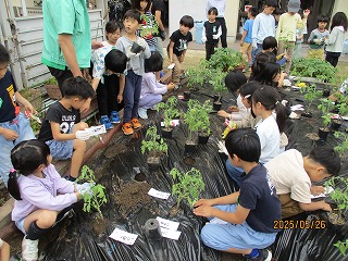 農産物情報センターの方と京果さんとトマトの学習をしました。トマトの産地の岐阜県についてやトマトの育て方について説明を聞いてから、畑にトマトの苗を植えました。