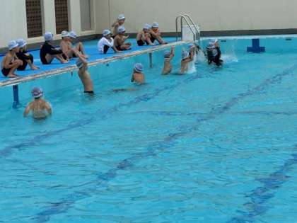 2年生以上の学年では、自分で活動内容や場を選んで「みずあそび」や「水泳」の学習を進めていますが、1年生は実態を踏まえ、一斉指導で学習をしています。