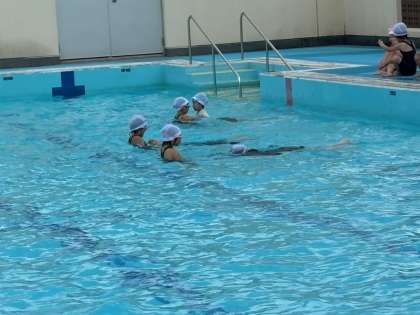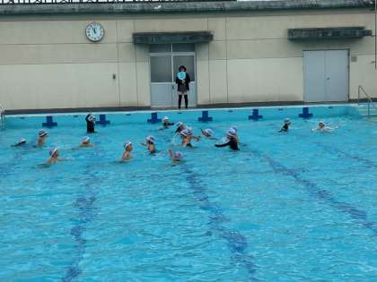 今までは2時間続きの授業でしたが、今日からは1時間での学習になりました。だいぶ水に慣れてきた様子がうかがえ、みんな積極的に楽しく「みずあそび」の学習を進めていました。