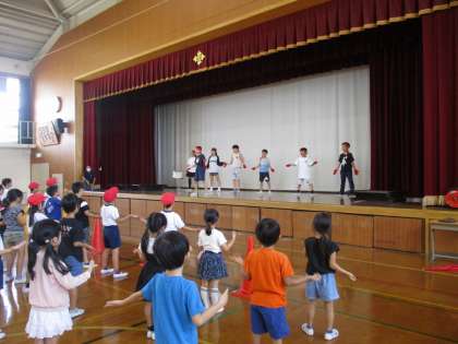 今日の中間休みは、赤組の応援の練習を全校で行いました。
