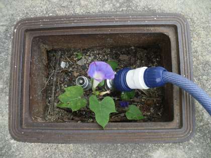 こぼれ種でしょうか。給水栓のところで花を咲かせたアサガオを見つけました。生命のたくましさを感じることができますね。