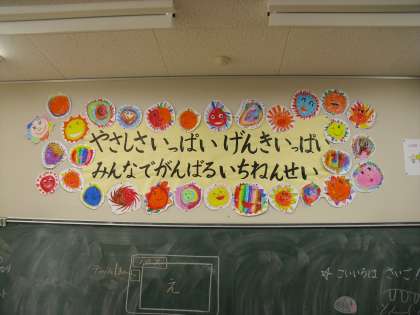 今日は1年1組の学級目標紹介です。「やさしさいっぱい げんきいっぱい みんなでがんばる1年生」です。担任の先生がまだ教室に来ていなくても,登校後1時間目の用意が素早くできるようになりました。子どもたちの成長は素晴らしいですね。