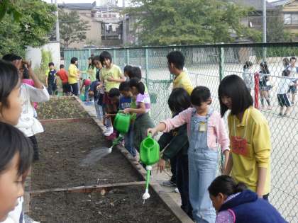 昨日,5年生が花壇に「キヌア」という植物の種まきをしました。キヌアは,最近注目を集めている穀物です。育てるに当たって,協力指導を京都府立桂高等学校にお願いしました。桂高等学校は,植物クリエイト科・園芸ビジネス科などを設置しており,園芸/農業に力を入れておられます。6人の高校生と担当の先生に種まきや水やりの注意点をお聞きして作業しました。12月の収穫が楽しみです。